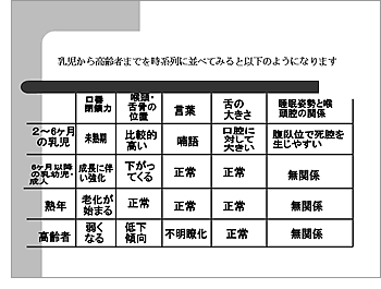 高齢者になると喉頭の高さを維持する力が弱くなることから、またいろんな疾病がおきてきます。熟年では、生活習慣病の原因になってきます。それをひとつのプリントにするとこういうことになります。(右図)